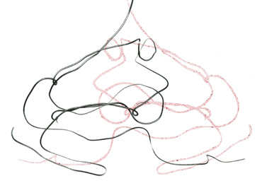 analog, Kleinbild) auf 30 x 40cm Barytpapier. In dieser Fotografischen Serie habe ich mich unter dem Gesichtspunkt Form mit Fundstücken (Draht, Tonbänder und Silvesterüberbleibsel unterschiedlicher Verformung) beschäftigt. Der zufällige, reduzierte Duktus und die lineare Form haben mich dazu angeregt, im Grunde Nutzloses zu fotografieren, durch Spiegelung völlig zu abstrahieren und damit zu ästhetisieren. Die aufgespritzte, rote Farbe des Gegenstückes lässt dabei das Gesamtgebilde bewusst an Adern (>Äderungen), gleichsam Energieflüsse, erinnern. Zur Verdopplung der Bildwirkung beziehe ich neben der fotografischen Abbildung die Zeichnung mit ein. Poetische Fotoarbeiten entstehen, die dazu verführen, den eigenen Blick zu intensivieren. |